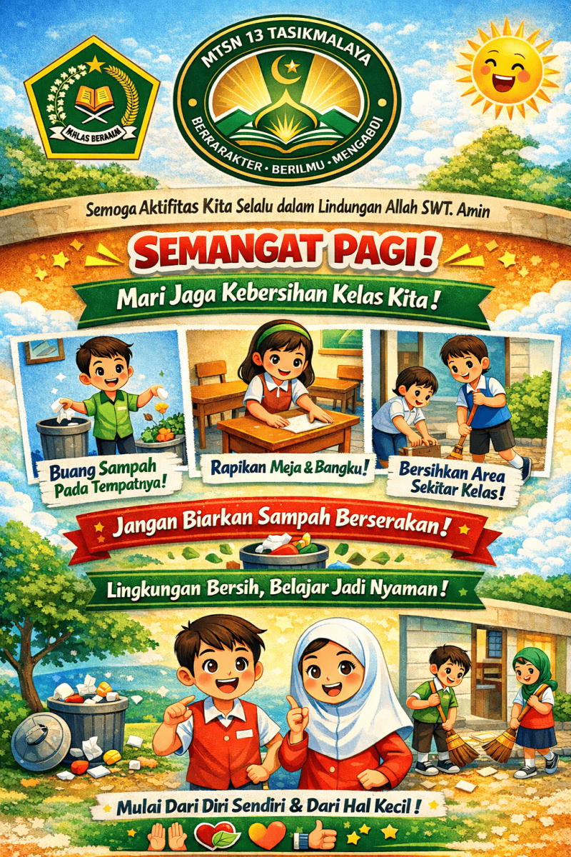 Tasikmalaya – Dalam upaya membangun lingkungan belajar yang kondusif dan berkarakter, Kepala MTsN 13 Tasikmalaya secara konsisten menyampaikan himbauan pagi kepada seluruh guru dan tenaga kependidikan untuk mengawali kegiatan pembelajaran dengan perhatian khusus terhadap kebersihan lingkungan kelas.
